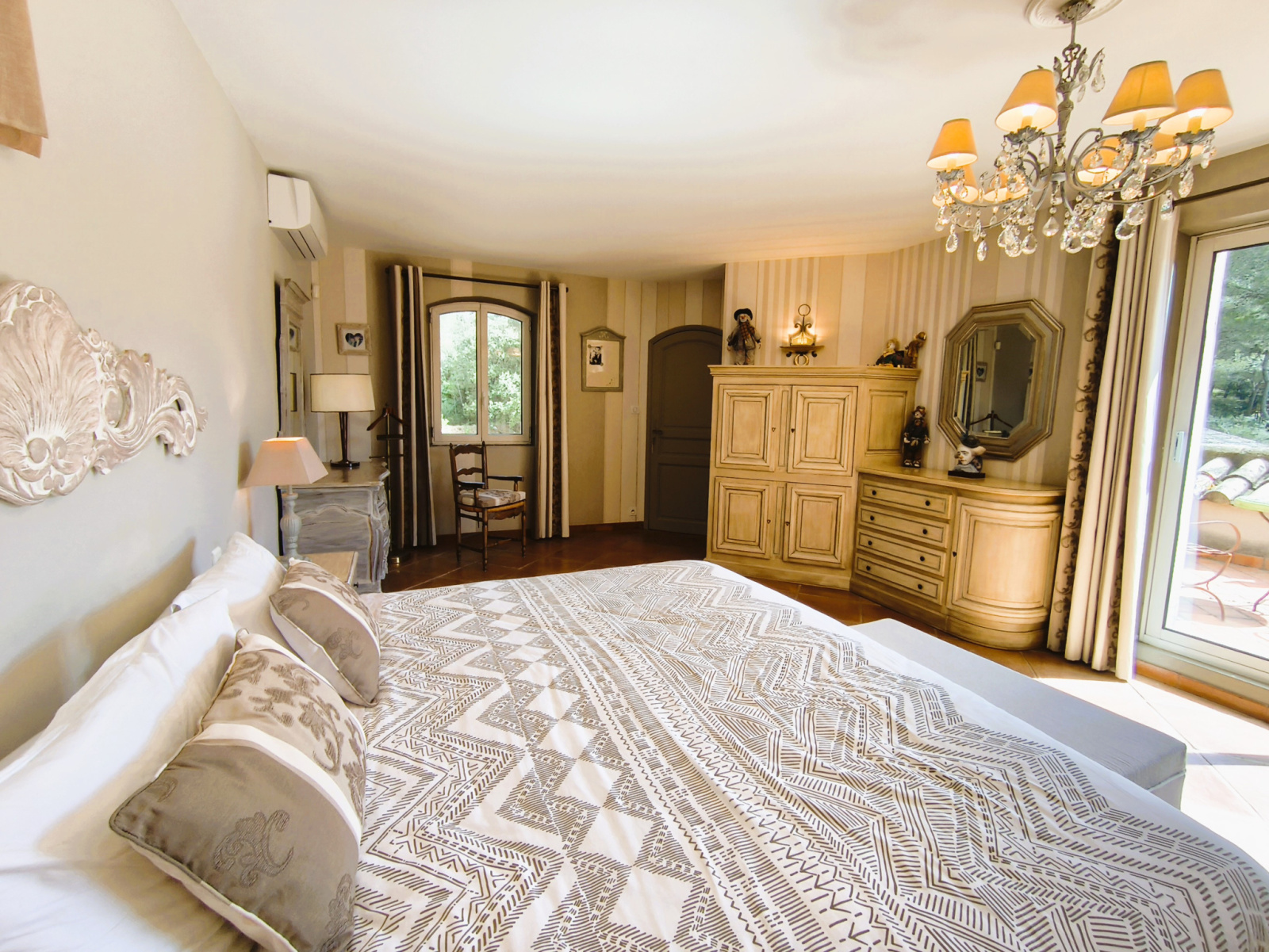 À l’étage, une suite parentale climatisée avec terrasse privative offre une vue imprenable sur la piscine et le jardin.