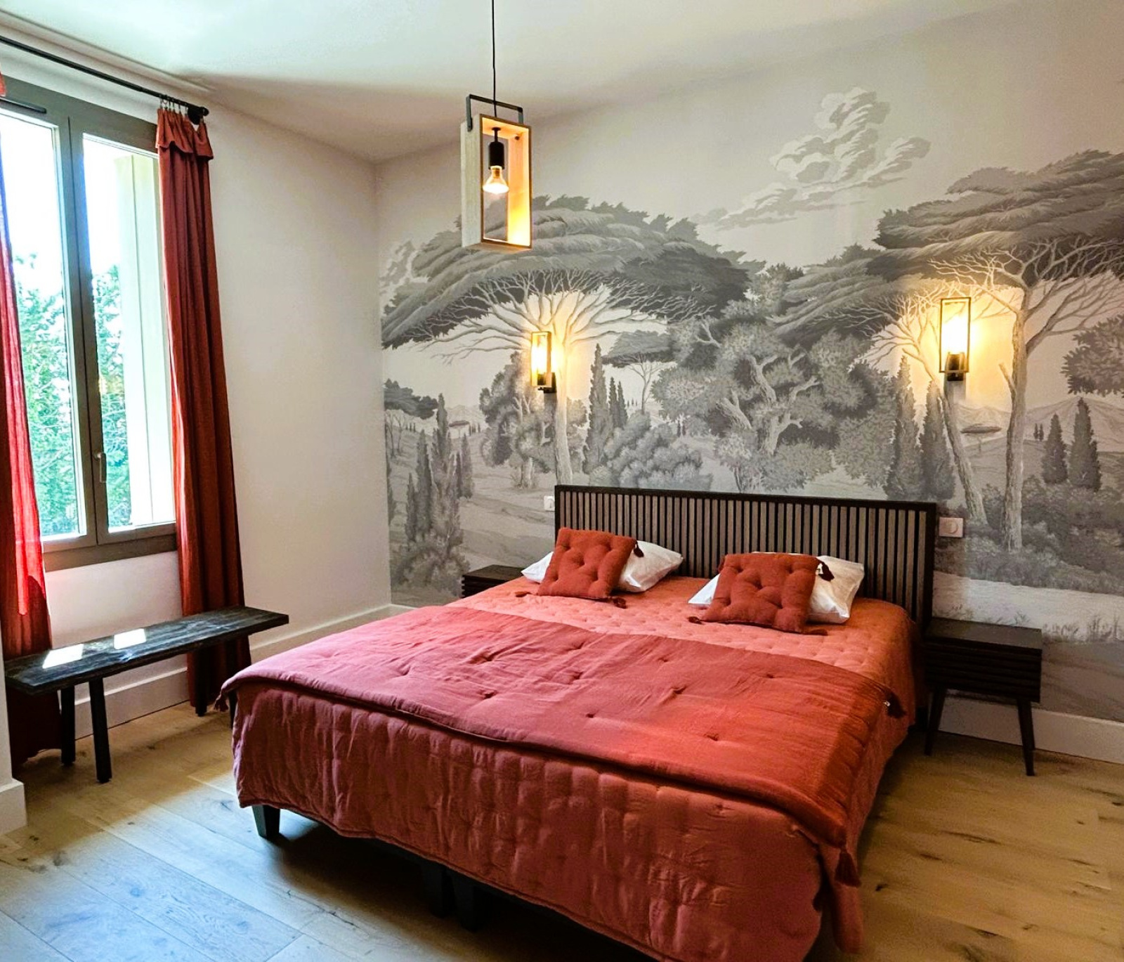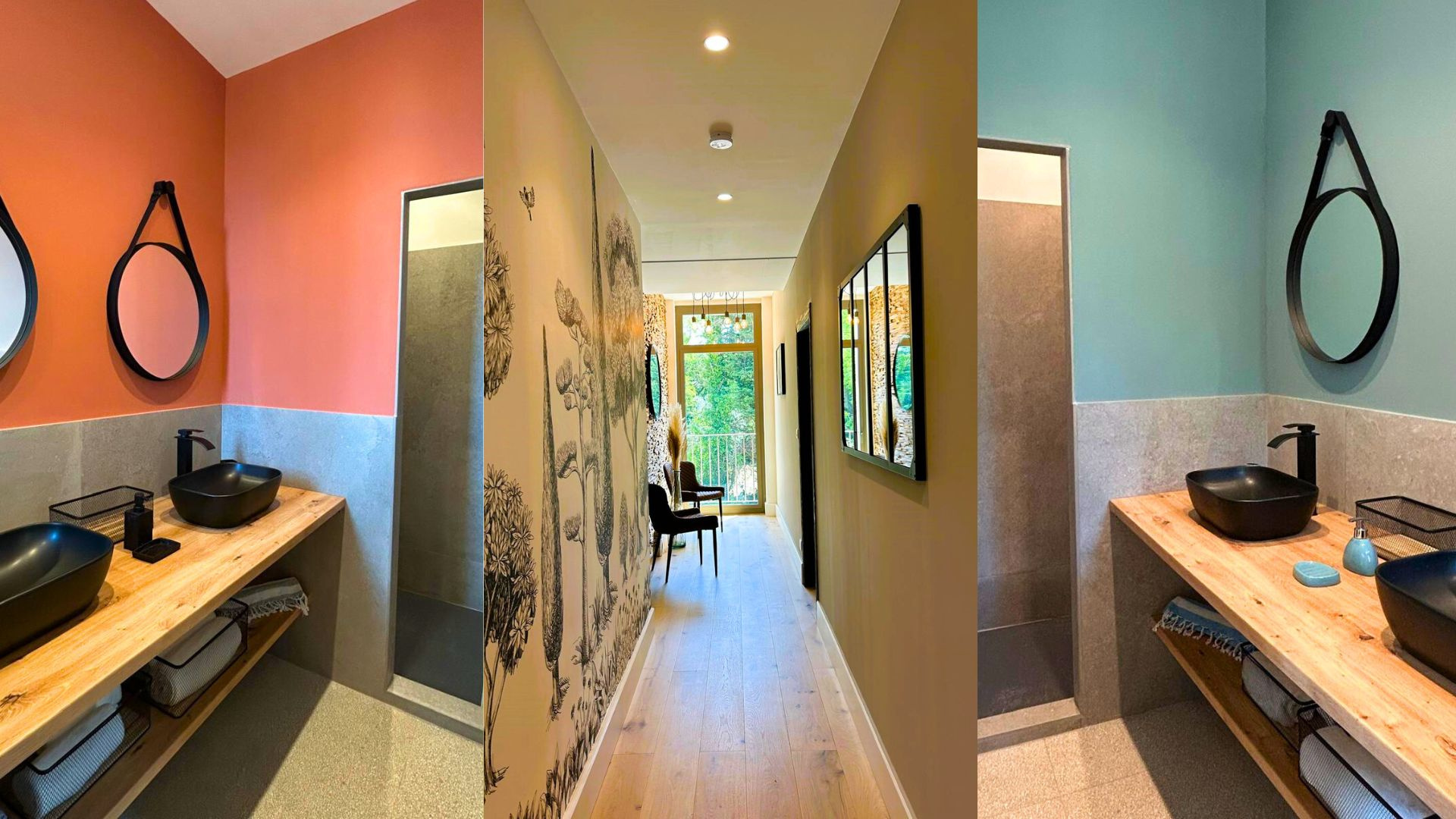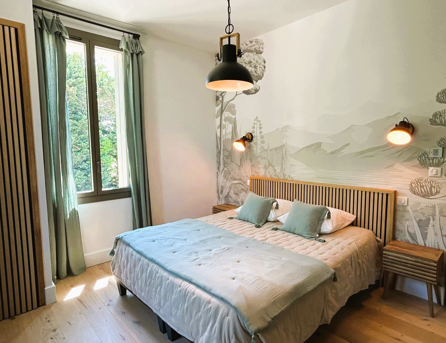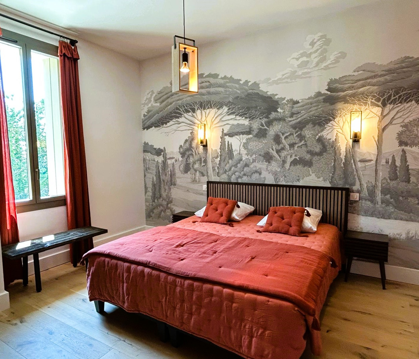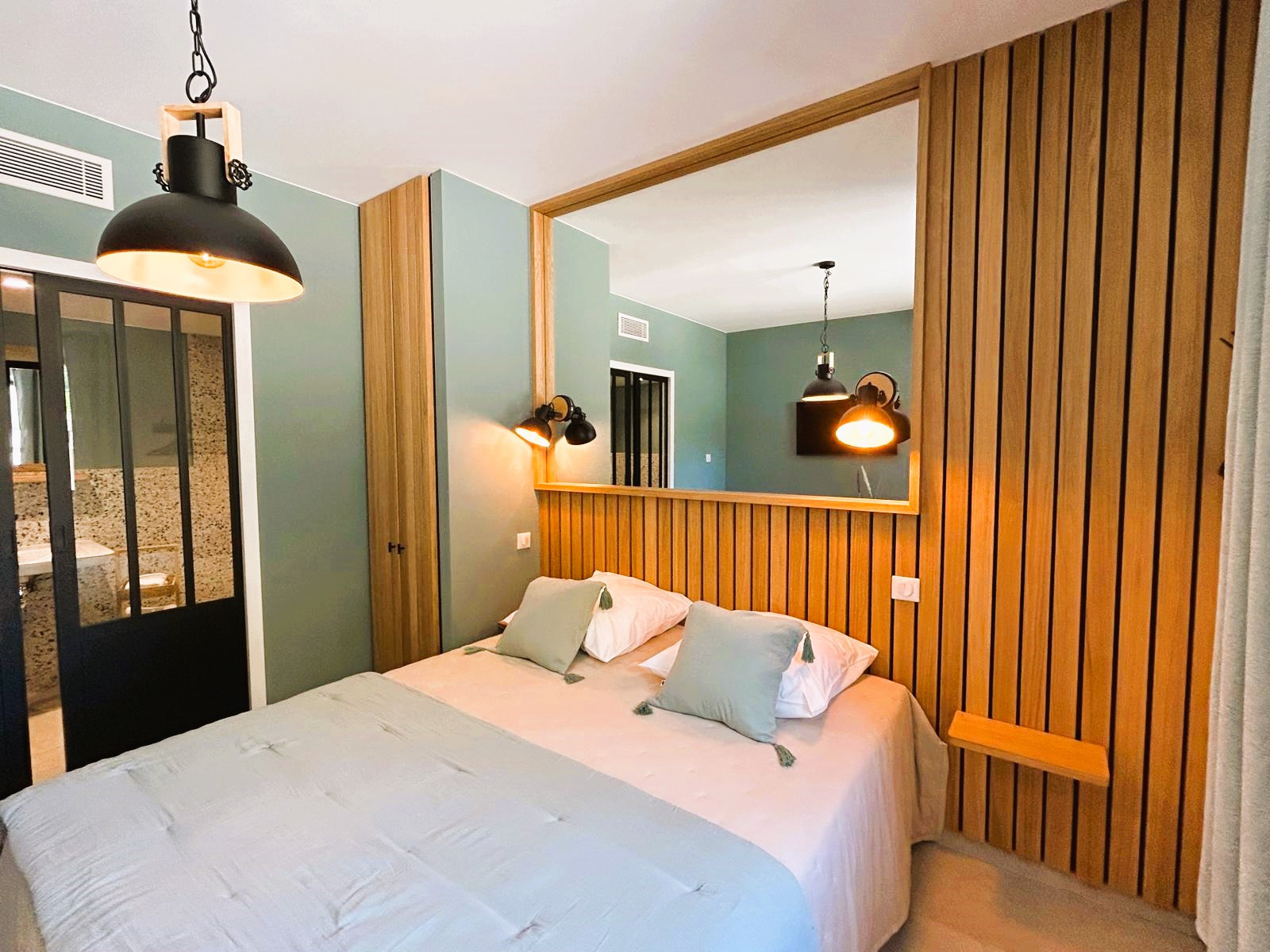 Côté nuit, cinq suites parentales tout confort, chacune avec salle d’eau privative, dont une accessible aux personnes à mobilité réduite au rez-de-chaussée.