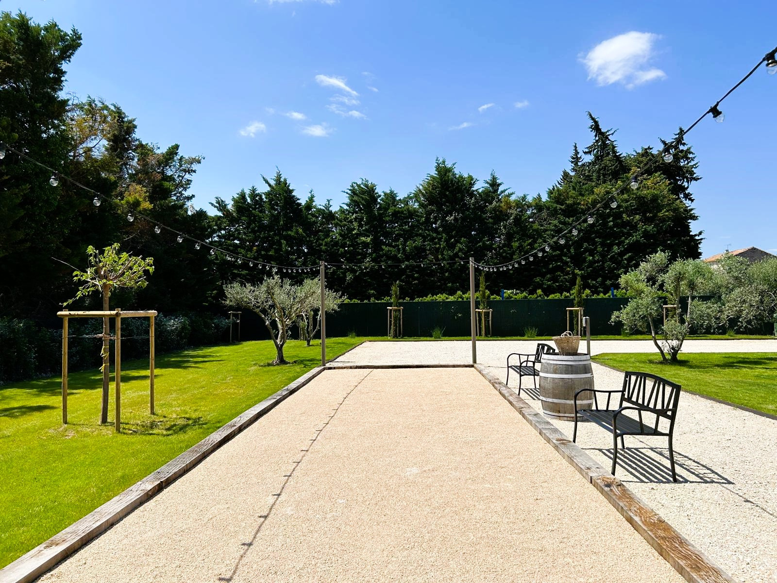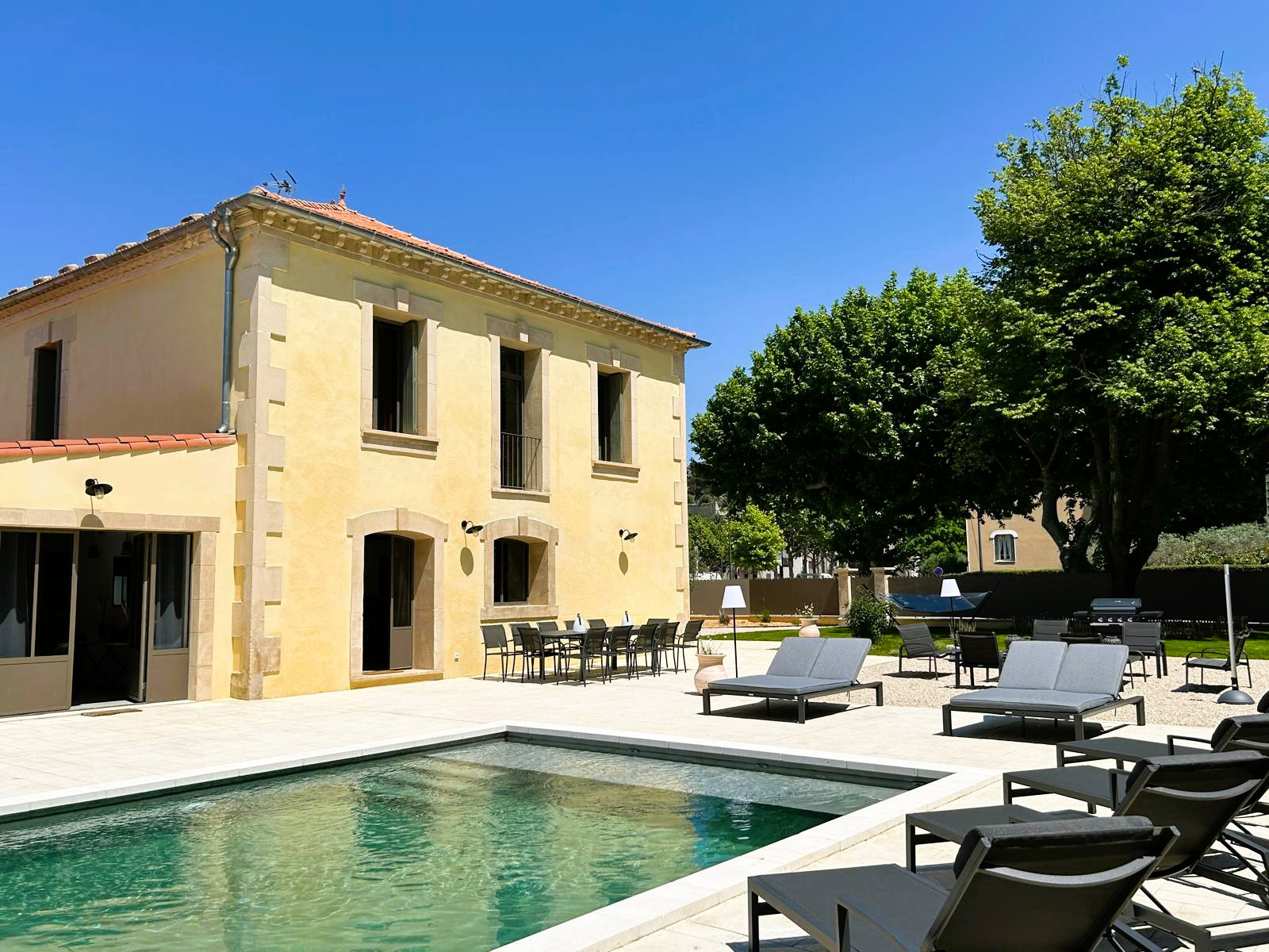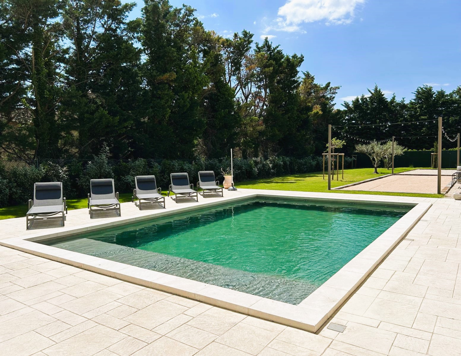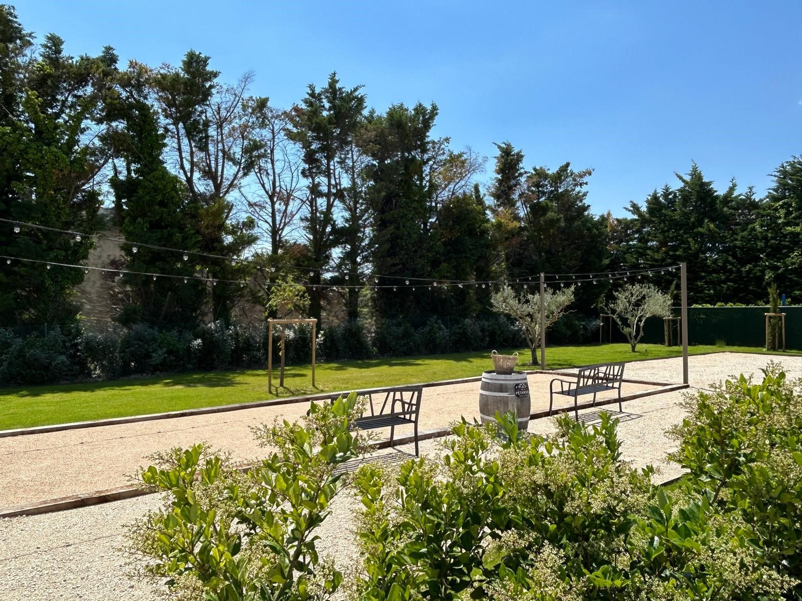 À l’extérieur, Piscine chauffée avec plage sécurisée et transats, salon de jardin avec barbecue à gaz, terrain de pétanque, parking privé avec borne de recharge électrique, le tout protégé par un portail éléctrique.