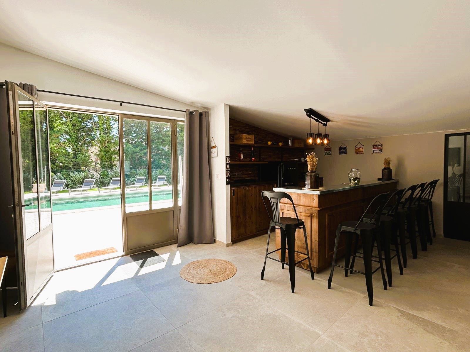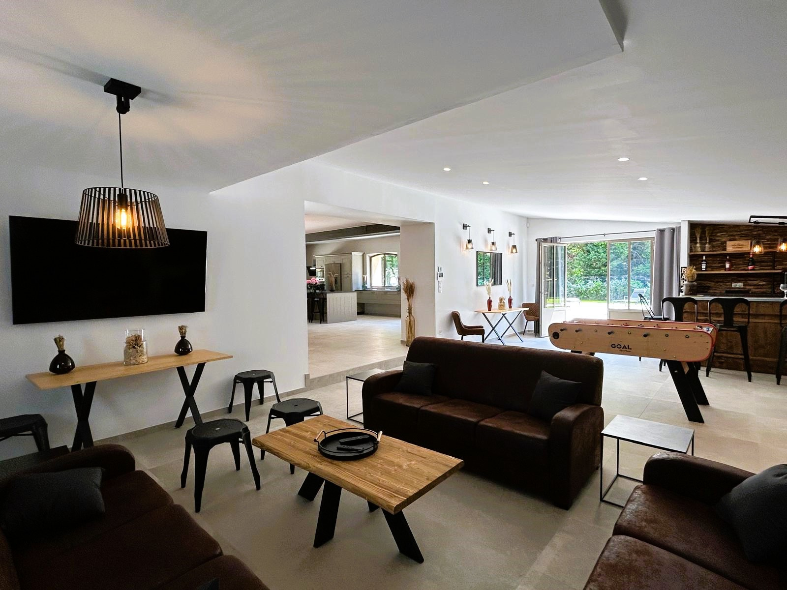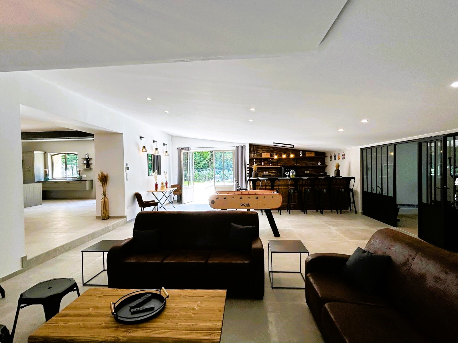 A l' intérieur, Conçue pour accueillir jusqu’à 10 personnes, cette maison de vacances vous invite à profiter d’une cuisine ouverte conviviale, d’un salon chaleureux, d’un espace bar agrémenté d’un babyfoot, ainsi que d’une salle de remise en forme et d’un coin bien-être avec jacuzzi.